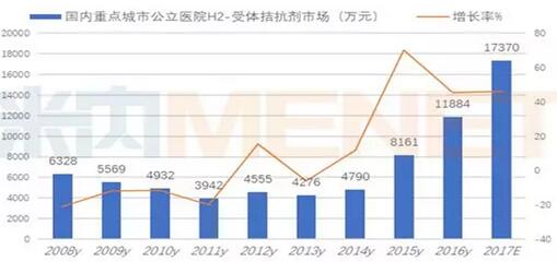 米內網數據顯示,2016年國內重點城市公立醫院H2受體拮抗劑用藥金額為1.19億元,同比上一年增長率為45.62%。據2017年1~3季度數據估算,2017年國內重點城市公立醫院替丁類藥物市場為1.74億元,同比上一年增長率為46.16%。